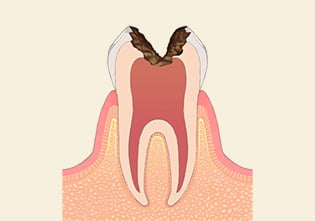 虫歯が象牙質内部の神経と血管が複合している「歯髄」にまで大きく進行している状態です。これまでと違い、食事や睡眠が食事や睡眠が正常に取れないほど激しい痛みを伴い、これを歯髄炎と呼びます。痛みによって正常な生活を送れないだけでなく、早急に治療をしなければ、歯を失うリスクが高くなります。また、ごく稀に痛みを感じないまま神経が壊死してしまうこともあります。その場合であっても治療を行わなければ、歯の根の先に膿が溜まって痛みが表れたり、膿によって歯茎に瘤のようなものができたりと、様々なトラブルが発生します。